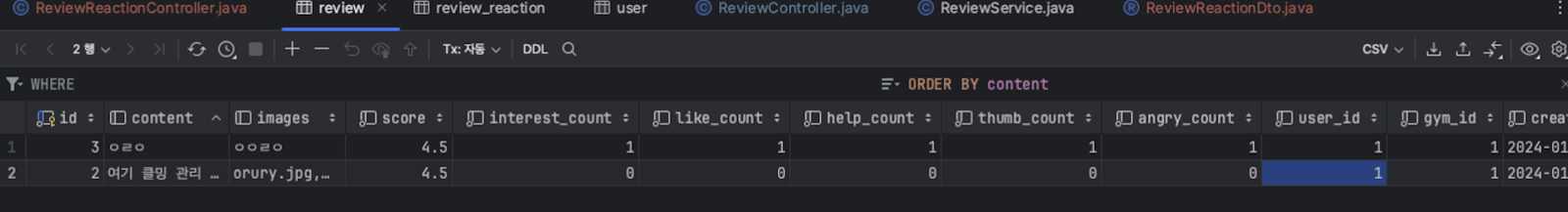 review_reaction 테이블에는 user_id가 1인 엔티티를 참조하는 review_reaction 엔티티가 2개 존재한다. (SQL로 연관 매핑)