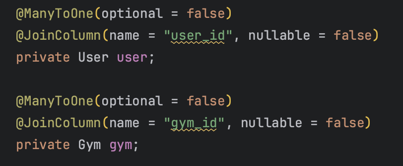 - Gym, User 를 참조하는 Review 엔티티 -> JPA의 @ManyToOne을 사용하여 연관관계를 표현했다.