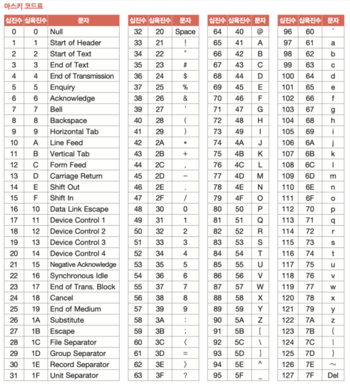 아래의 코드표와 대응하는 것이 곧 인코딩 하는 것이다.