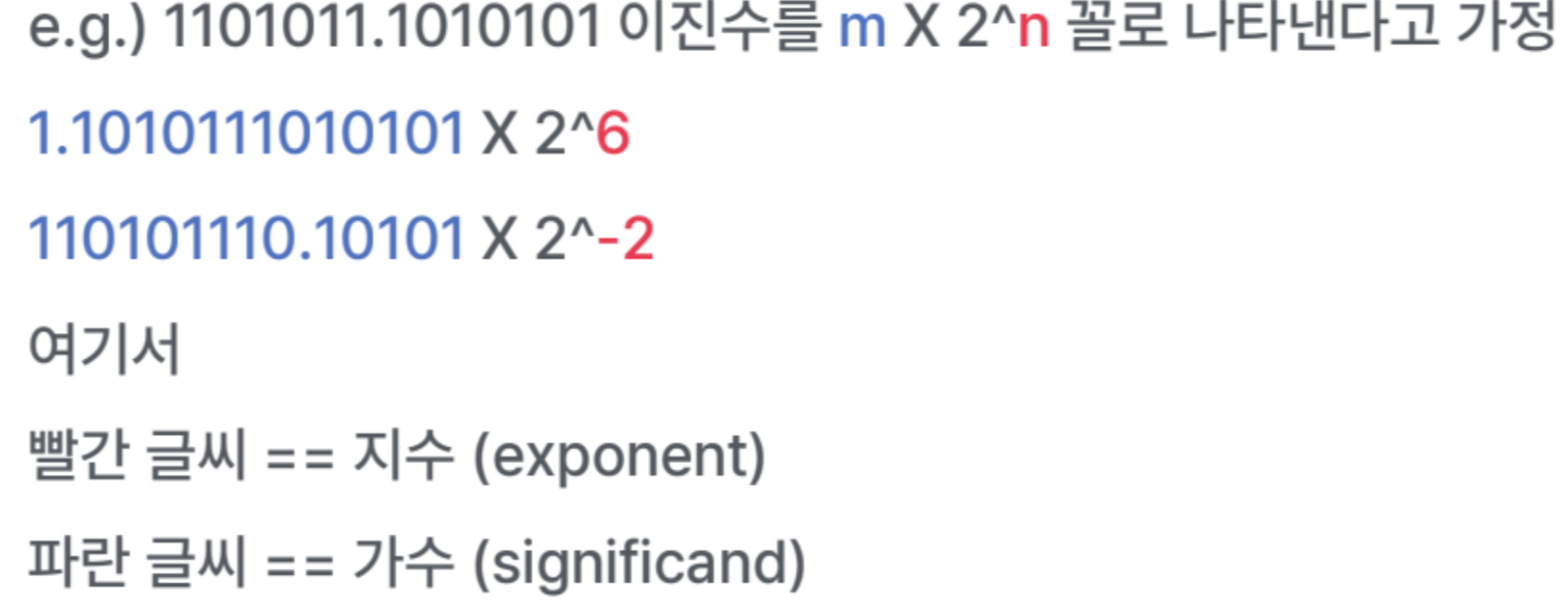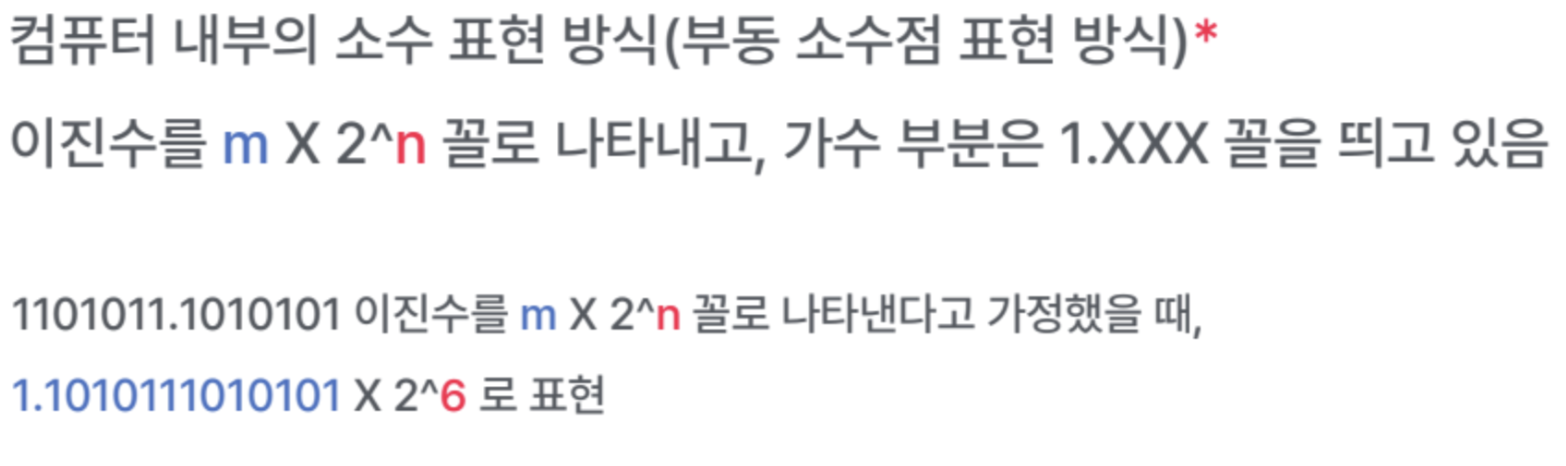 - 십진수 소수를 이진수로 표현할 때 십진수 소수와 이진수 소수 표현이 딱 맞아 떨어지지 않을 수 있다