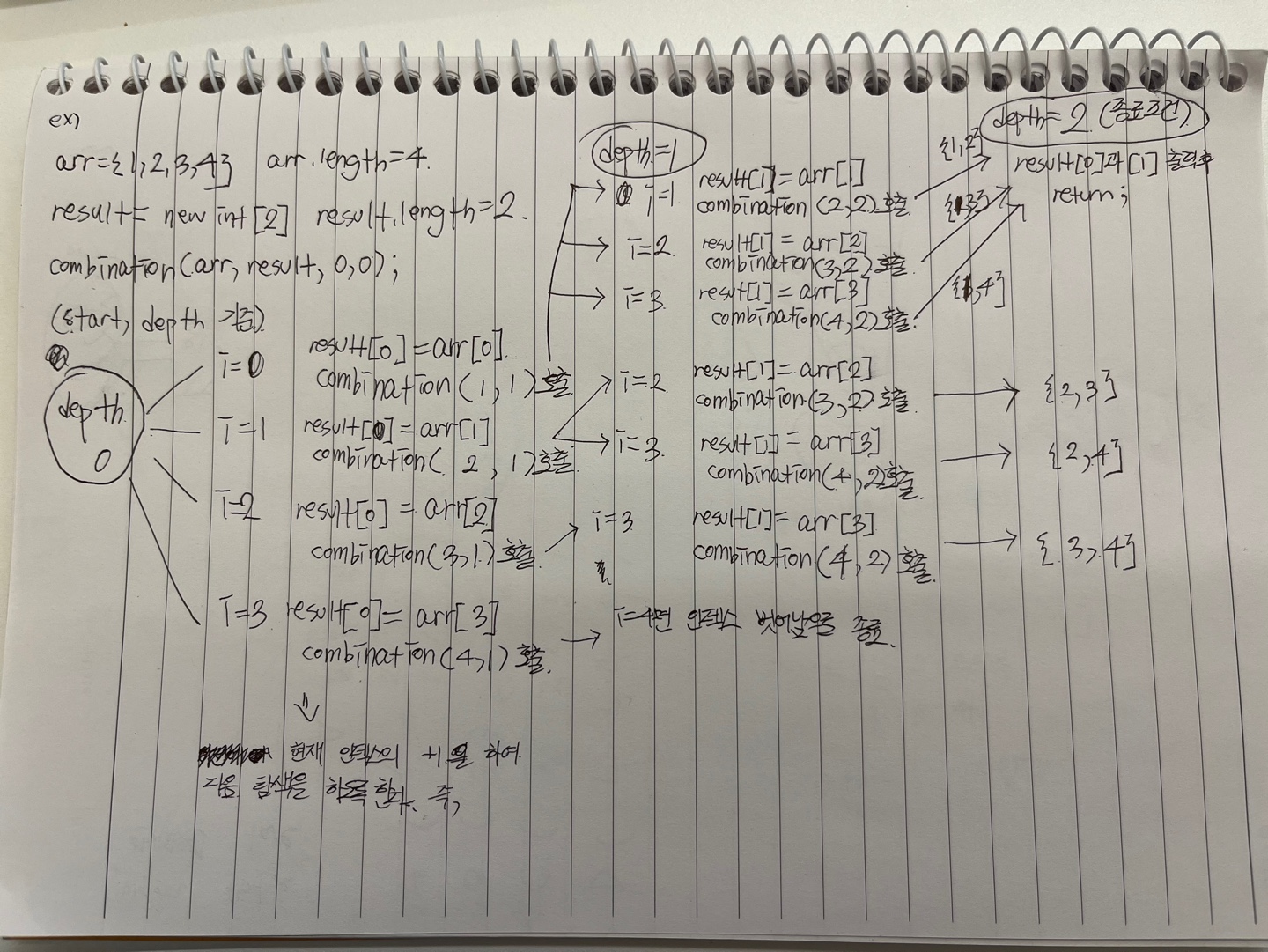 - depth가 result.length보다 작을 때, start 인덱스부터 arr.length까지 각 숫자를 순회하며 모든 경우의 수를 탐색