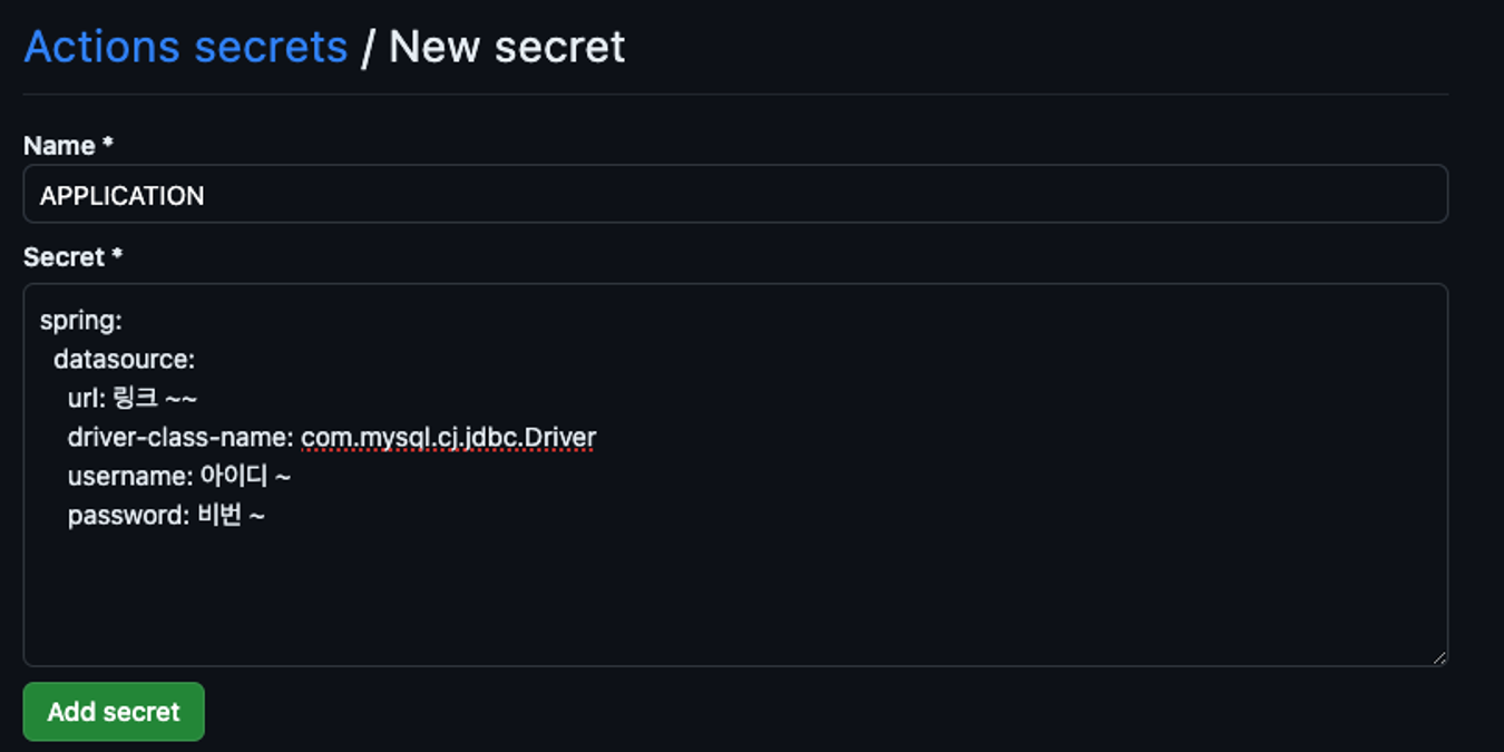 Github Actions에는 secret 값을 설정할 수 있는 기능이 있다. 해당 기능 통해 secret 값을 설정하면 민감한 정보를 secret을 통해 가져올 수 있다. 나는 APPLICATION 이름을 가진 secret을 생성했다. 값으로는 application.yml 파일을 복붙했다.