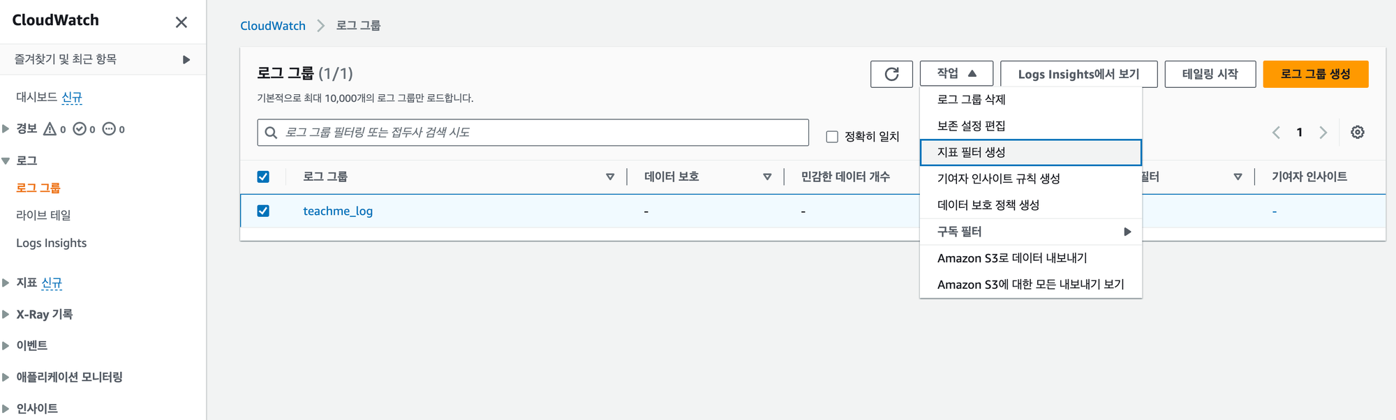 생성해둔 로그 그룹을 체크한 후 작업 → 지표 필터 생성을 클릭한다.