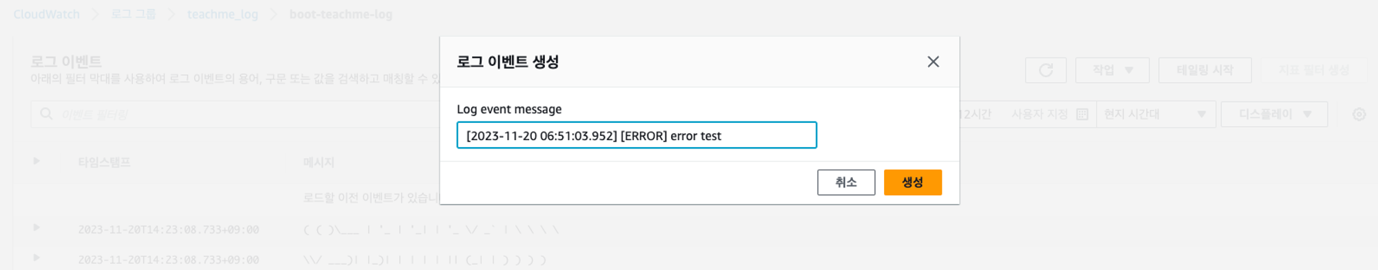 성공적으로 이메일에 알람이 오는지 확인하기 위해 연결된 로그 스트림에서 작업 → 로그 이벤트 생성을 클릭하여 ERROR 가 포함된 이벤트를 생성한다.