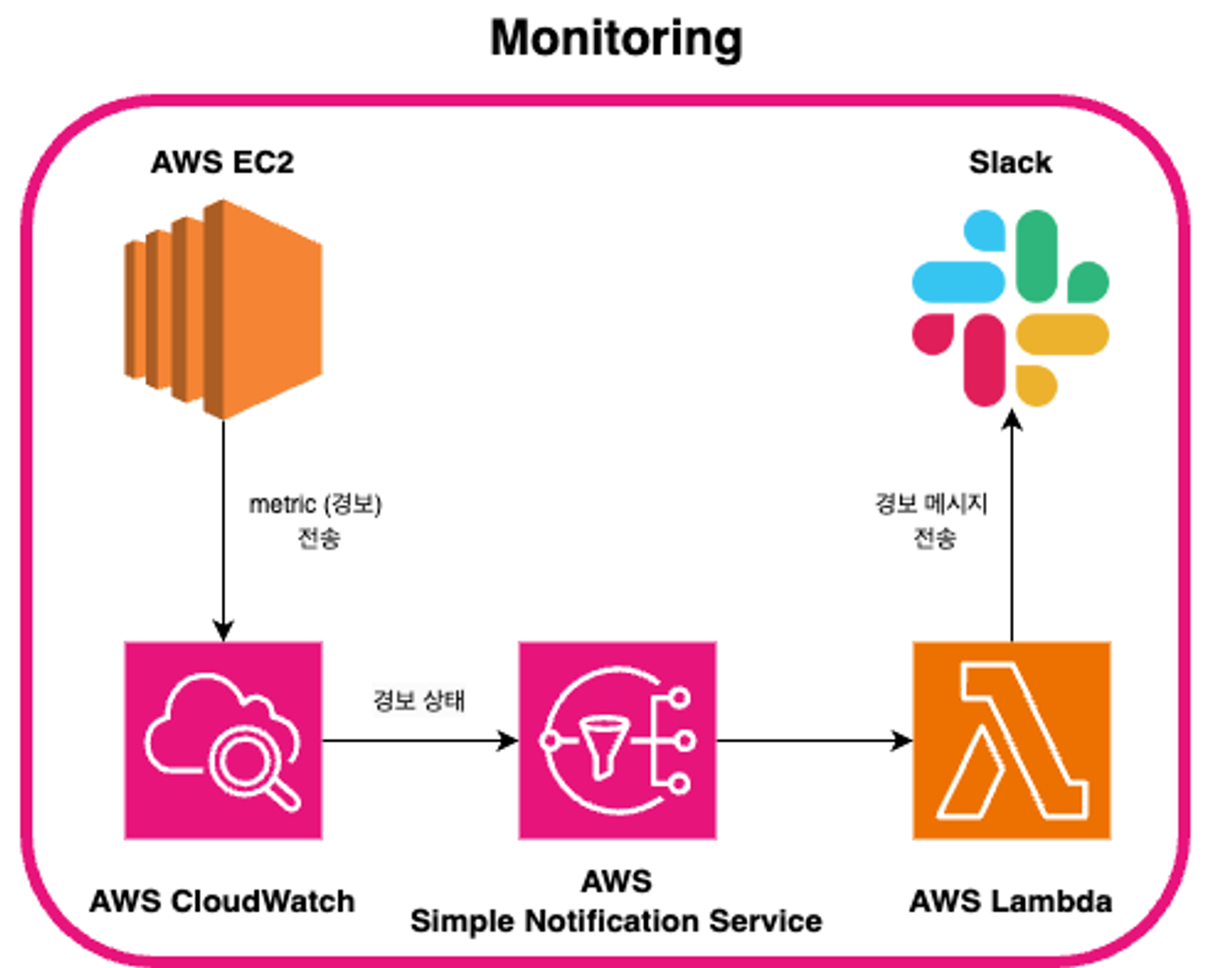 - 슬랙 알람 그룹 (EC2 로그) → 경보 5개 → 알람 트리거 → SNS 슬랙 알람