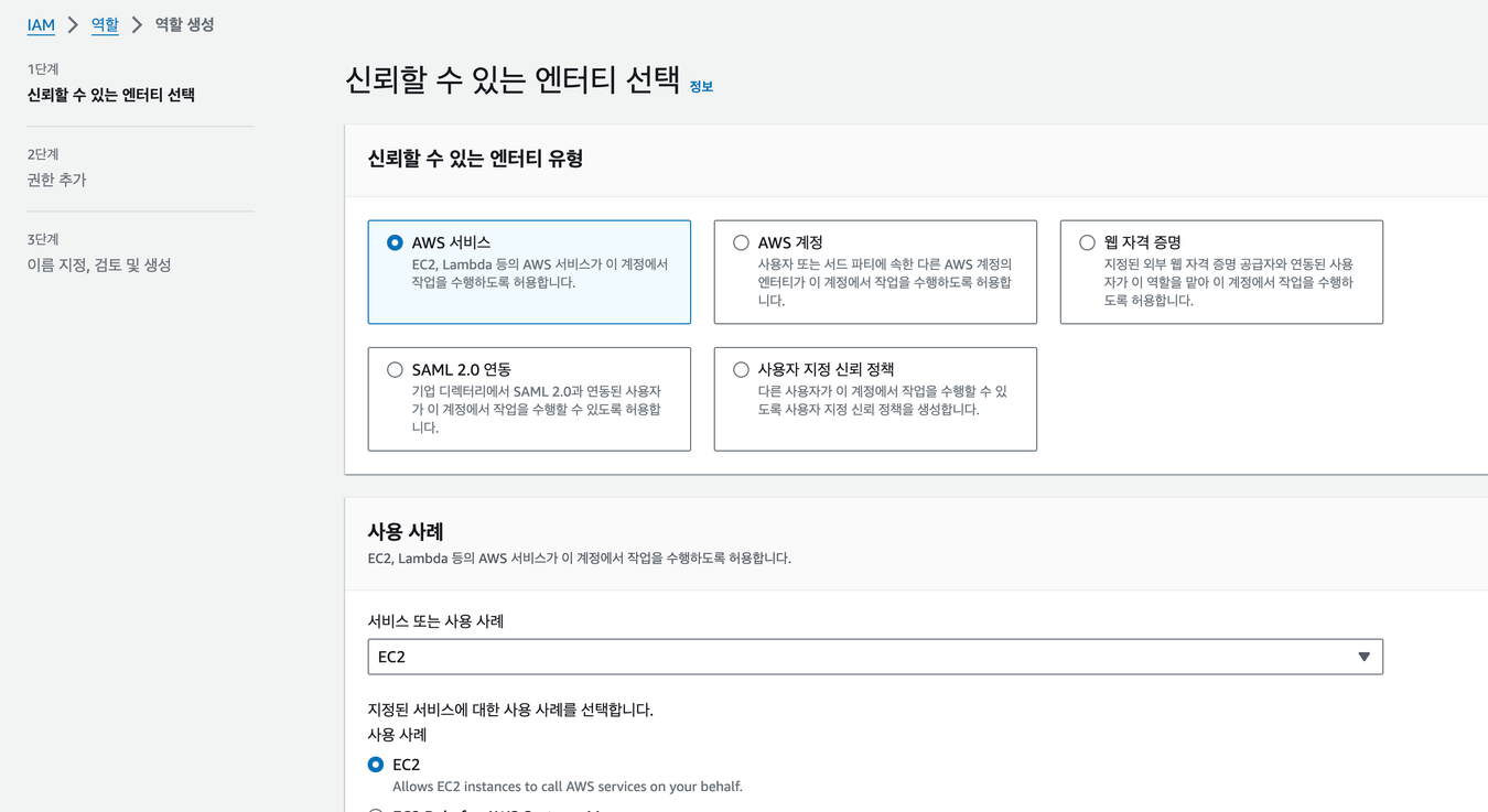 AWS에서 IAM → 역할 → 역할 생성에 들어가서 아래와 같은 역할을 생성한다.
