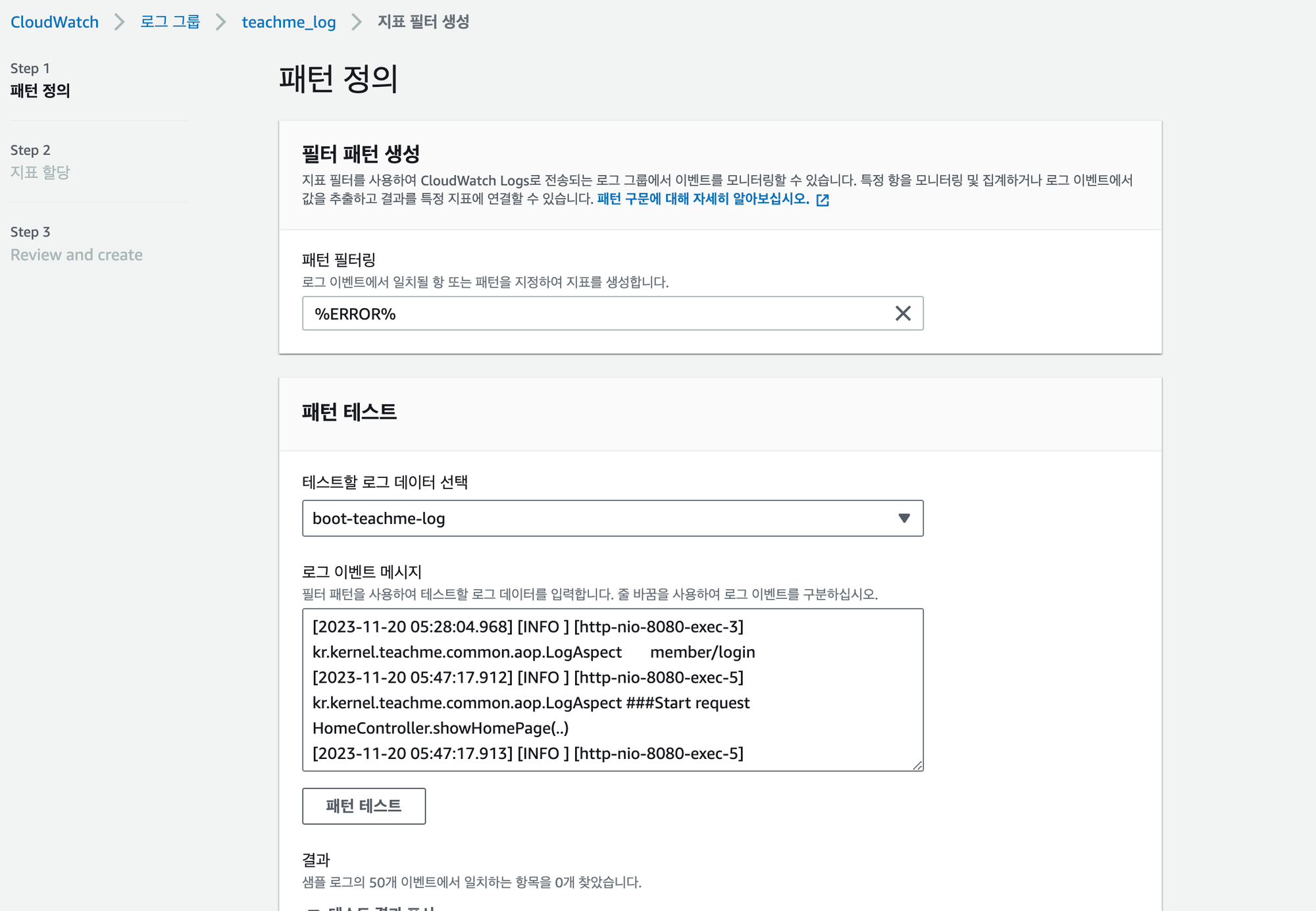 테스트할 로그 데이터를 선택하여 패턴 테스트를 진행할 수 있다. 내가 선택한 로그 데이터에는 아직 ERROR는 없기 때문에 따로 일치하는 항목을 찾을 순 없었다.