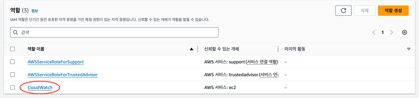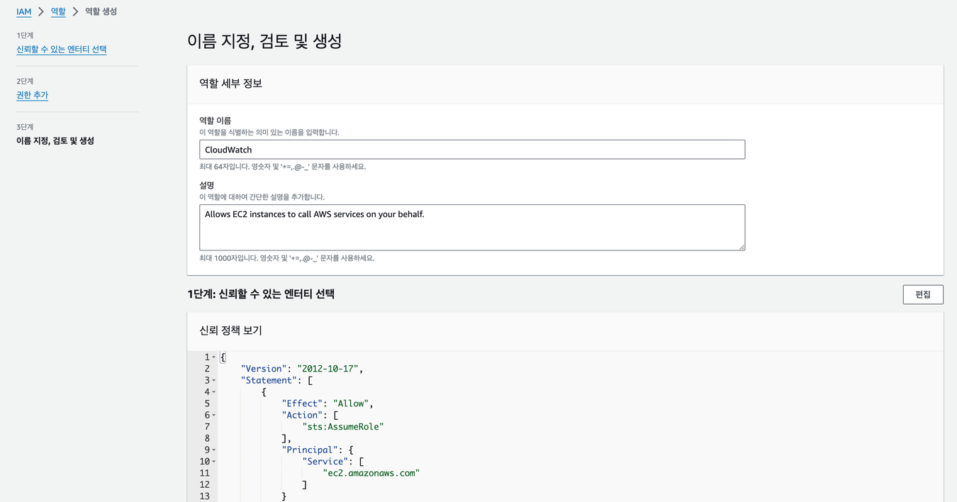 CloudWatch를 사용하기 위해 EC2에서 CloudWatch에 서비스를 액세스 할 권한을 줘야한다.