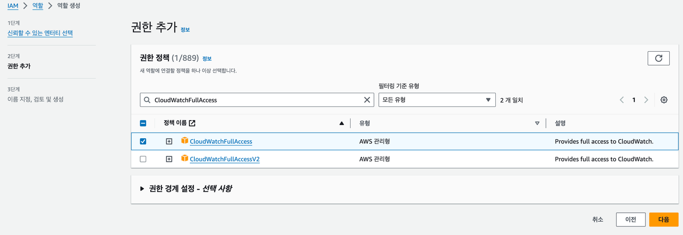 CloudWatchFullAccess 를 검색하여 추가한다.