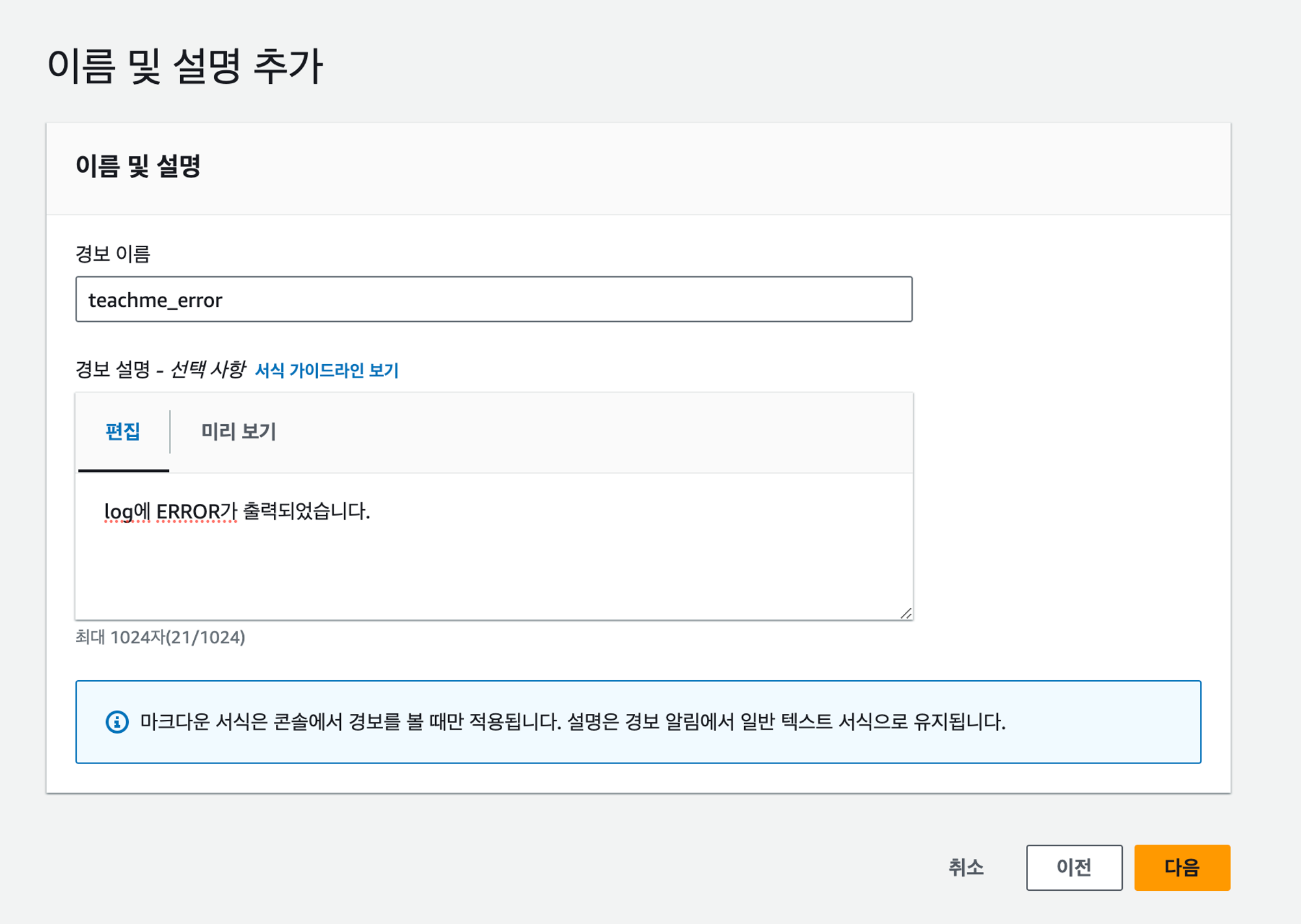 경보 이름과 설명을 입력한다.