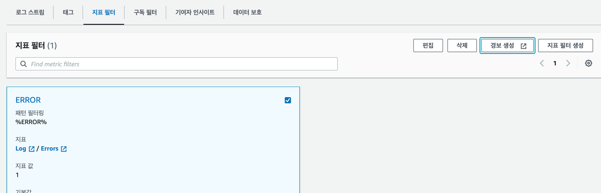 생성한 지표 필터를 체크한 후 경보 생성을 클릭한다.