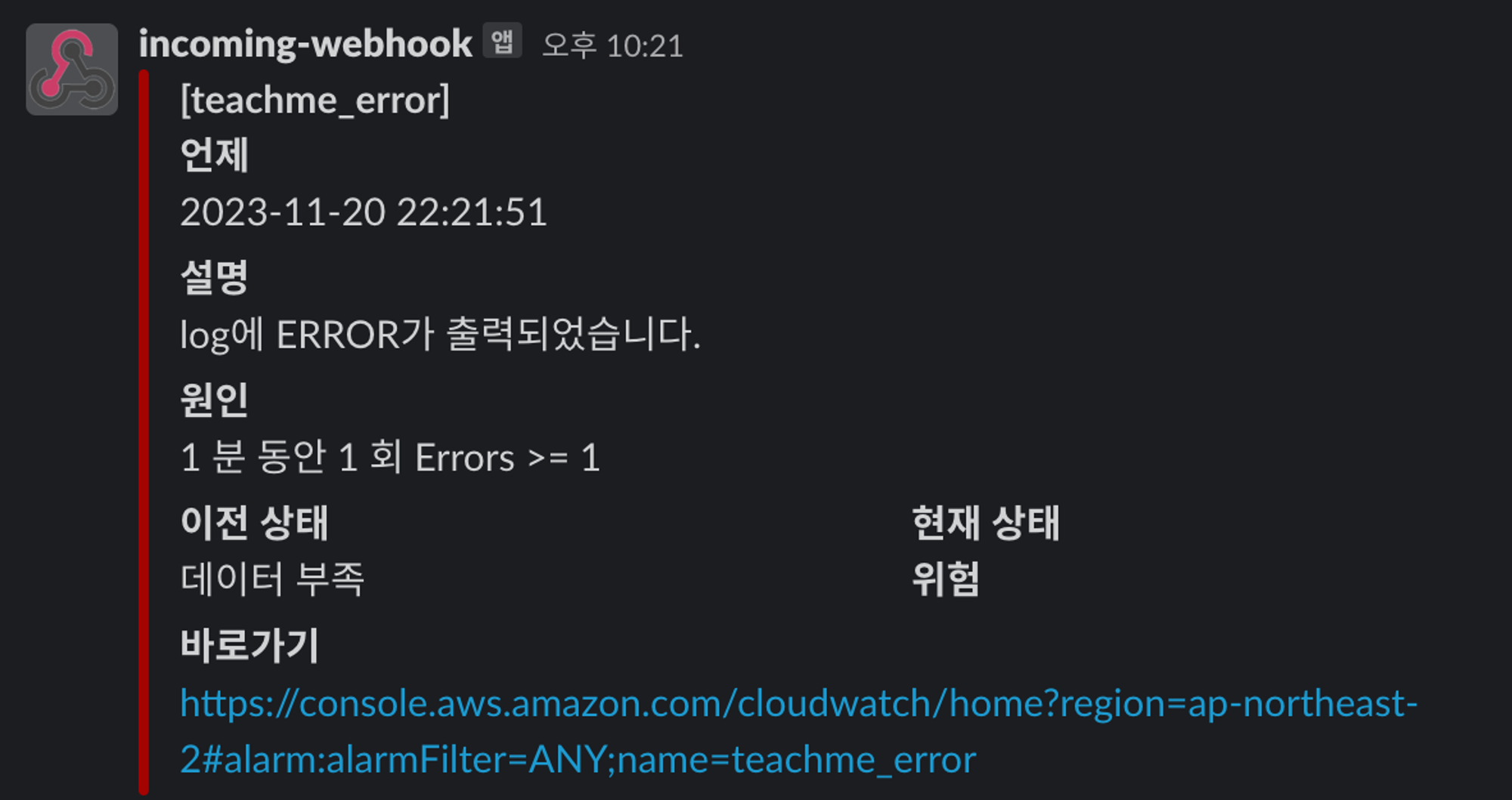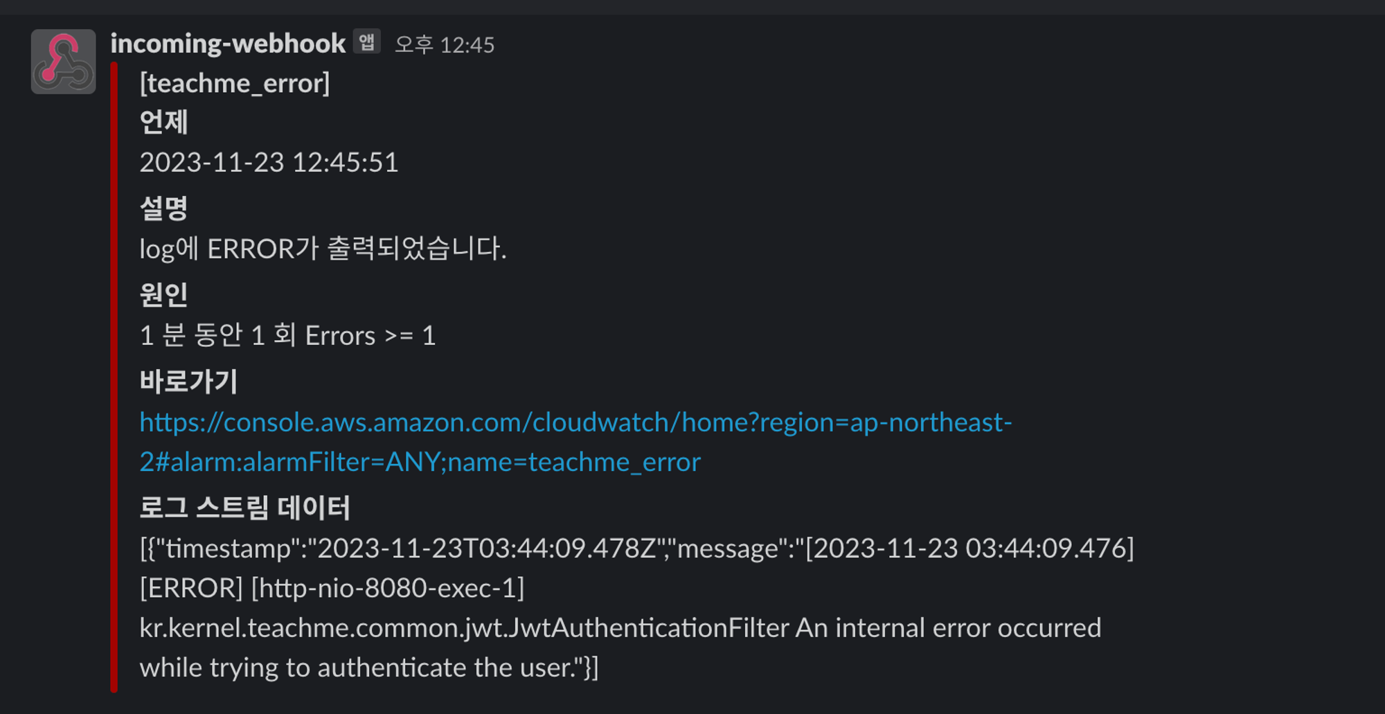 이제 teachme_error 경보가 발생하면 아래와 같이 slack 메시지가 전송된다.