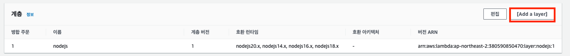 1. 기존 Lambda에 Nodejs 레이어 추가