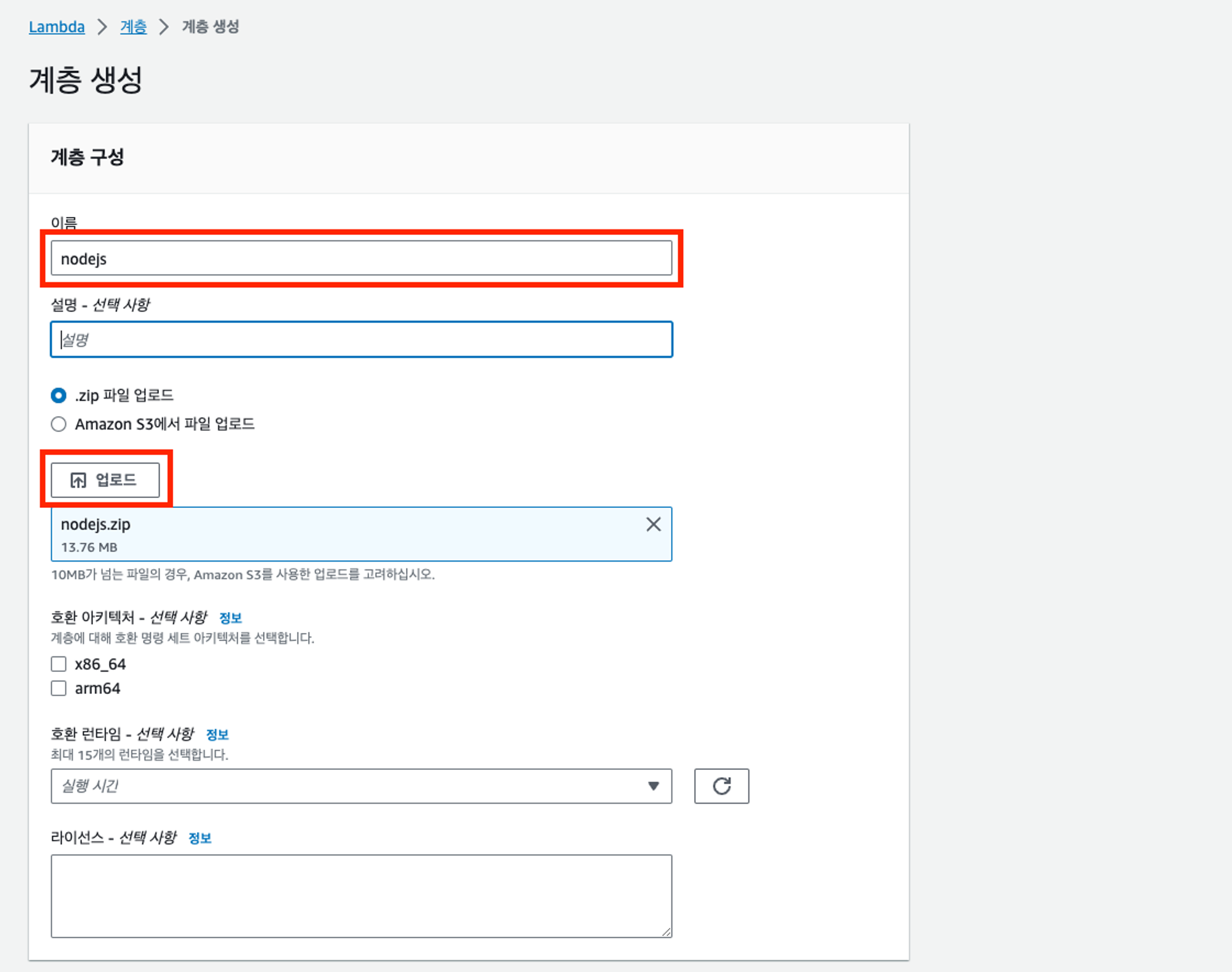 Lambda의 계층 탭에서 Add a layer를 클릭한 후, zip파일을 업로드하고 계층을 생성한다.