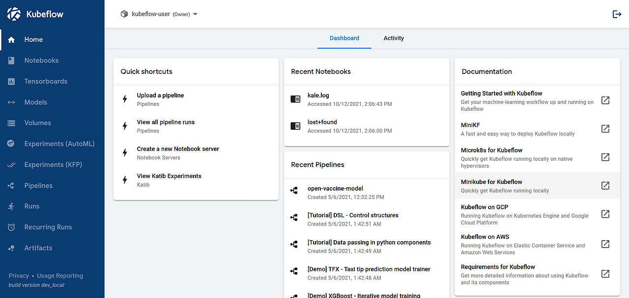 웹브라우저를 통해 대시보드 UI로 Notebooks, Experiments (AutoML), Experiments (KFP) 등의 컴포넌트를 이용할 수 있습니다.