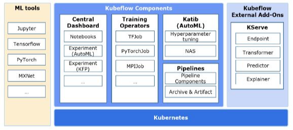 쿠브플로우는 End-to-End AI 플랫폼입니다. ML 워크플로우의 ML 모델 학습 ~ 배포 단계까지 모든 작업에 필요한 도구와 환경을 쿠버네티스(Kubernetes) 위에서 쿠브플로우 컴포넌트로 제공합니다.