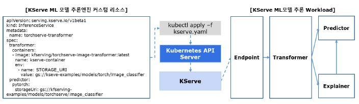 - 쿠브플로우는 KServe를 통해 쿠버네티스 환경에 머신러닝 모델을 배포하고 추론 기능을 제공합니다. KServe는 Endpoint, Transformer, Predictor, Explainer로 이루어져 있습니다. Transformer나 Explainer는 필요에 따라 추가 가능하며 Predictor 와 연결하여 사용합니다.
