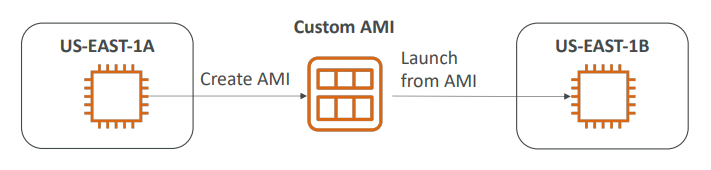 위 그림을 보면 두 개의 인스턴스가 각각 다른 AZ에 있다. 이 때, US-EAST-1A에서 AMI를 커스텀해서 만들었으면 , 다른 AZ인 US-EAST-1B에서는 해당 AMI를 copy해서 쓸 수 있다.